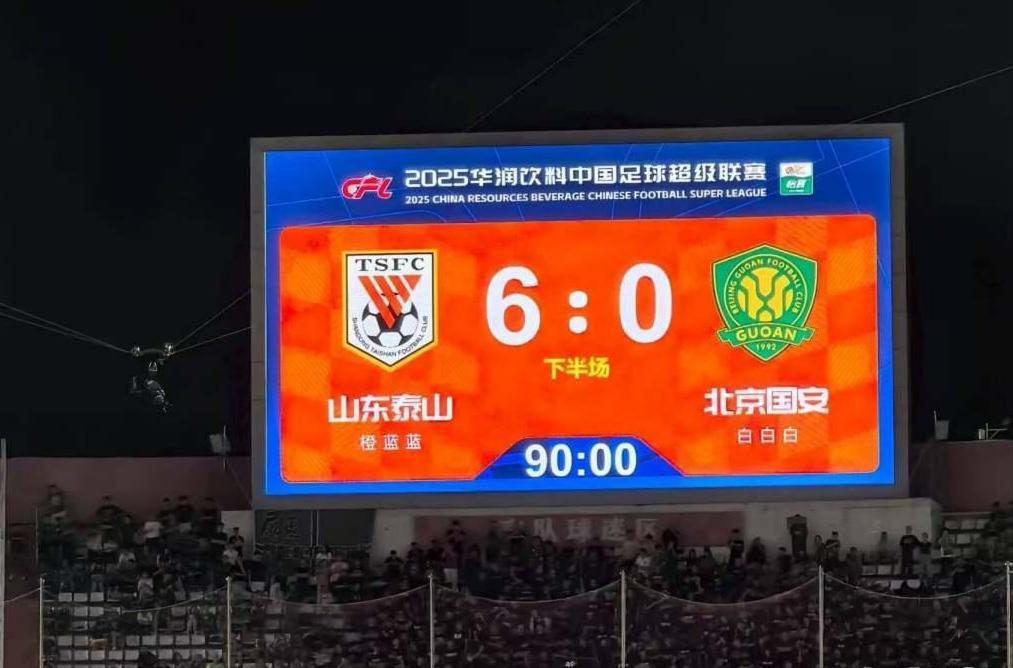1-0,2-0,3-0……山东济南奥体中心体育场上空电子屏上的比分一次次改写,让山东队主场观众陷入疯狂。山东泰山与北京国安的中超第23轮比赛,双方是多年的竞争对手兼宿敌,本赛季首次碰面北京国安更是主场踢了泰山一个6-1,一切都注定这是一场不平常的比赛。但当最终比分定格在6-0,还是让人感到难以置信。北京队守门员侯森瘫坐在地,而北京队的场上球员已经呆若木鸡。